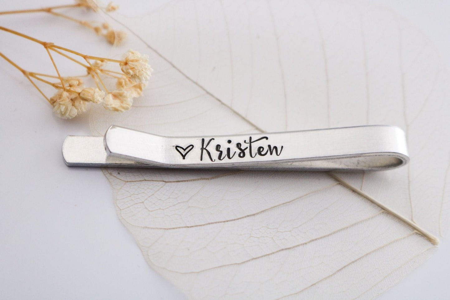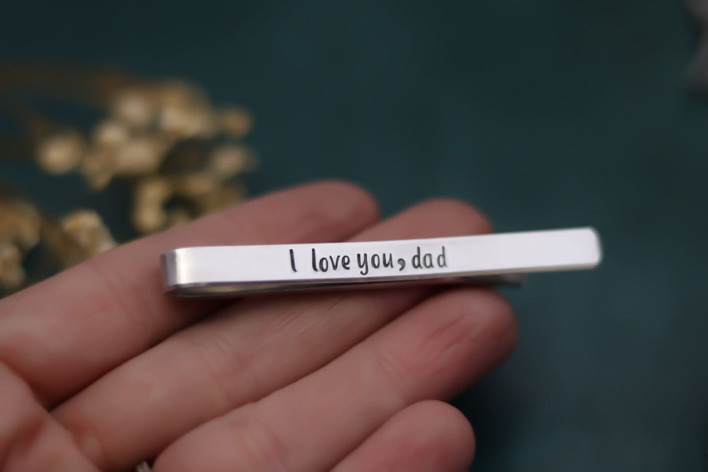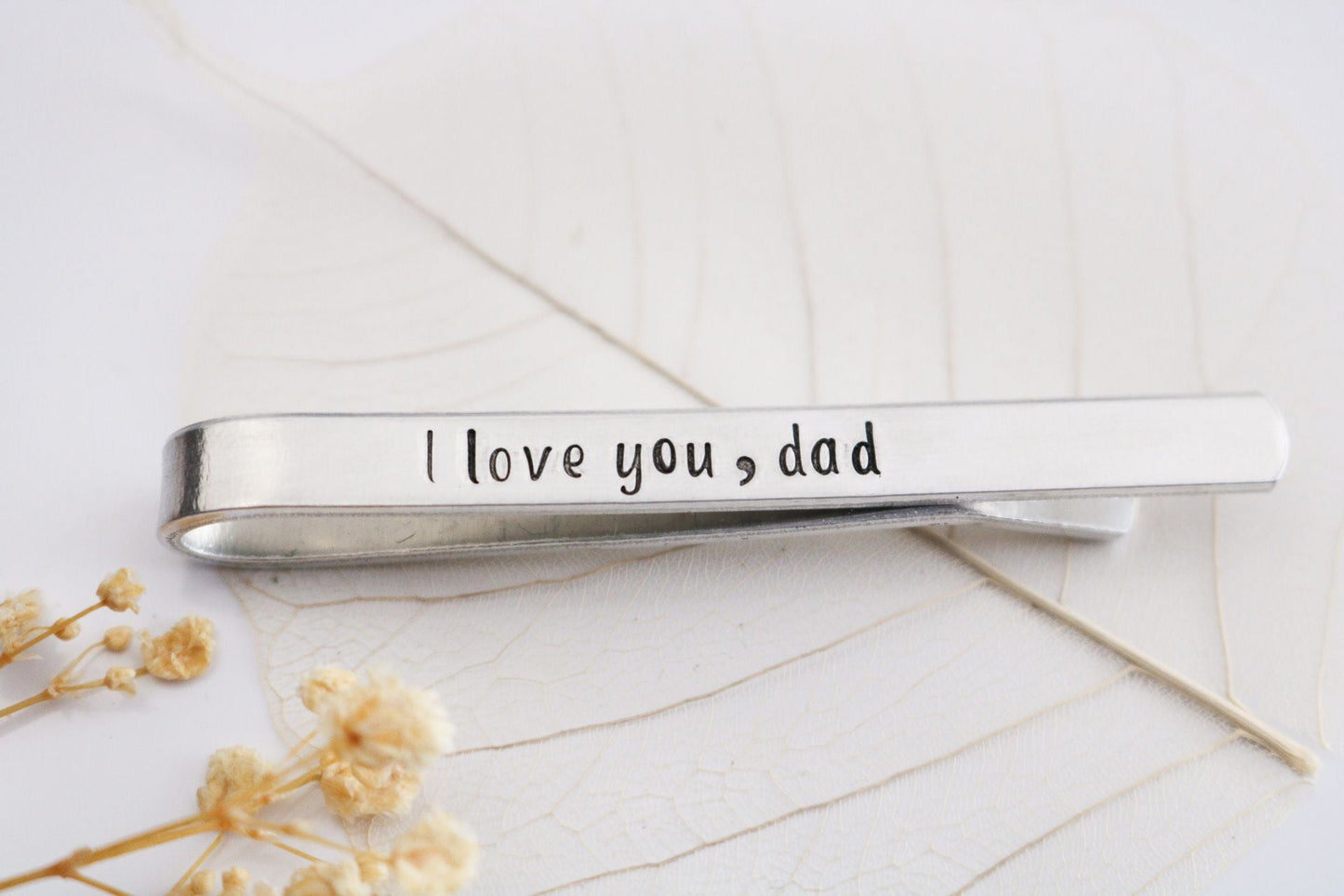 Looking for the perfect sentimental gift for the Father of the Bride? Our lightweight tie clips are hand stamped, letter by letter, with "I love you, dad" on the front. The back can be stamped with a heart and your name, making such a meaningful gift for the man who first had your heart.