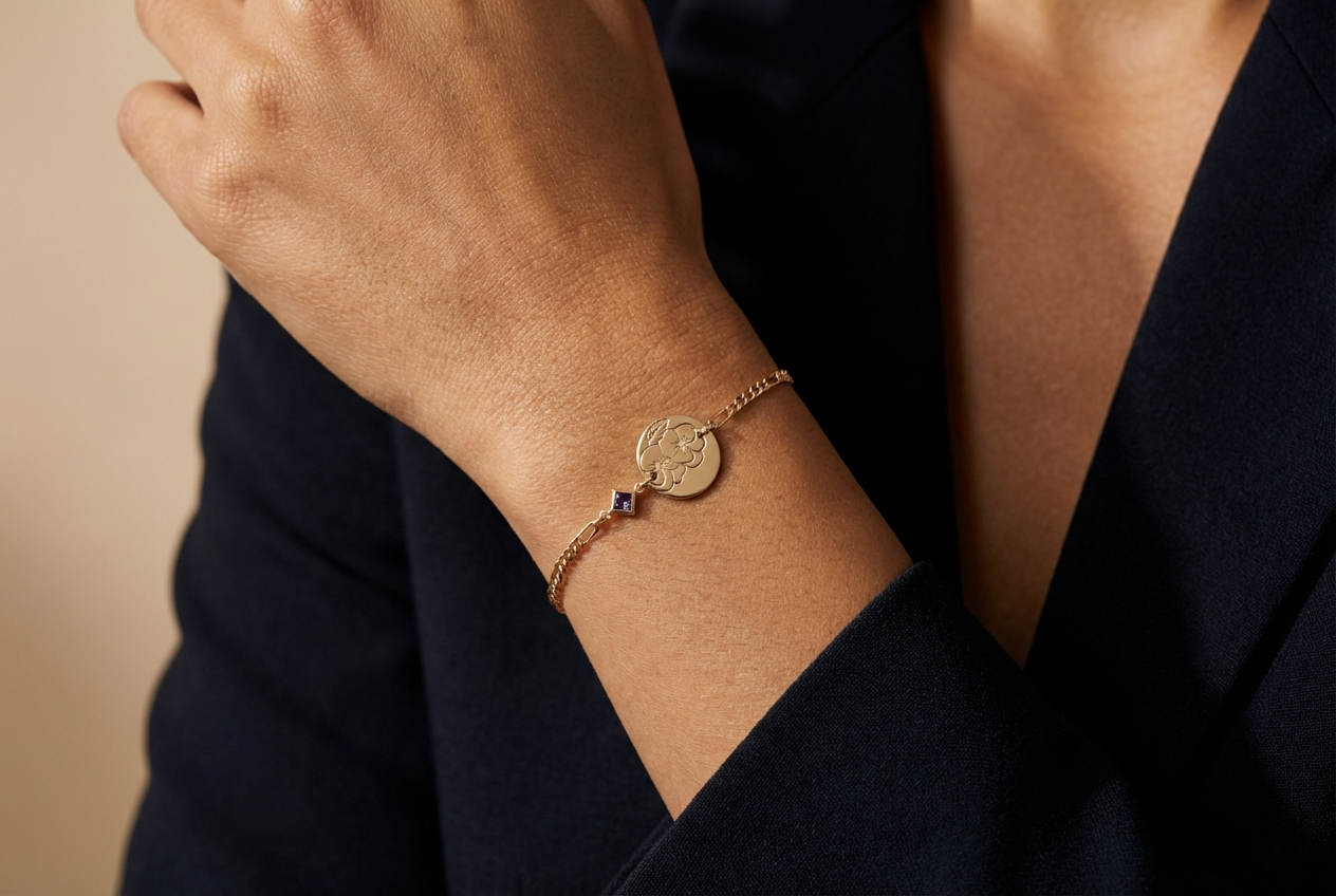 This meaningful bracelet pairs a hand-stamped birth flower with a sparkling diamond-shaped birthstone charm, capturing both beauty and connection in one timeless piece. The ½" classic disc is hand-stamped with your chosen bloom and paired with a delicate Figaro chain for a touch of everyday elegance.