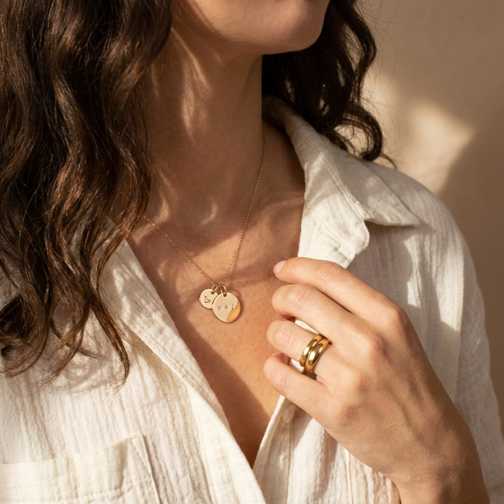 Three gold disc pendants: Mini (9.5mm), Classic (13mm), and Statement (16mm) for personalized engraving.
