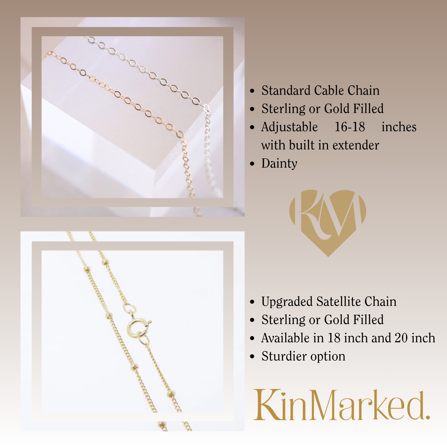 Your KinMarked piece is crafted from lasting 14k gold-filled or sterling silver—metals chosen to hold their beauty through life’s moments and milestones.